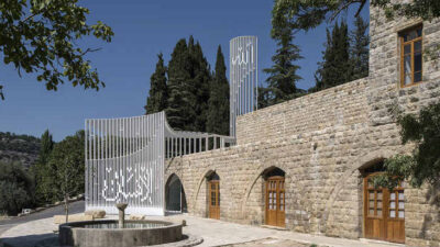 Di salah satu sudut belakang atap, bilah putih struktur membungkuk ke arah langit di menara yang menyiratkan sebuah menara. Cahaya dan udara mengalir di antara mata pisau, yang kontras dengan batu berwarna pasir tebal dari bangunan tradisional satu lantai di bawahnya. Di beberapa tempat, ruang di antara bilah terisi untuk menciptakan dua kata yang hanya bisa dirasakan dari kejauhan: di menara di atas, “Allah” atau “Tuhan,” dan di bawah, kata “al-insan” atau “manusia” . ”